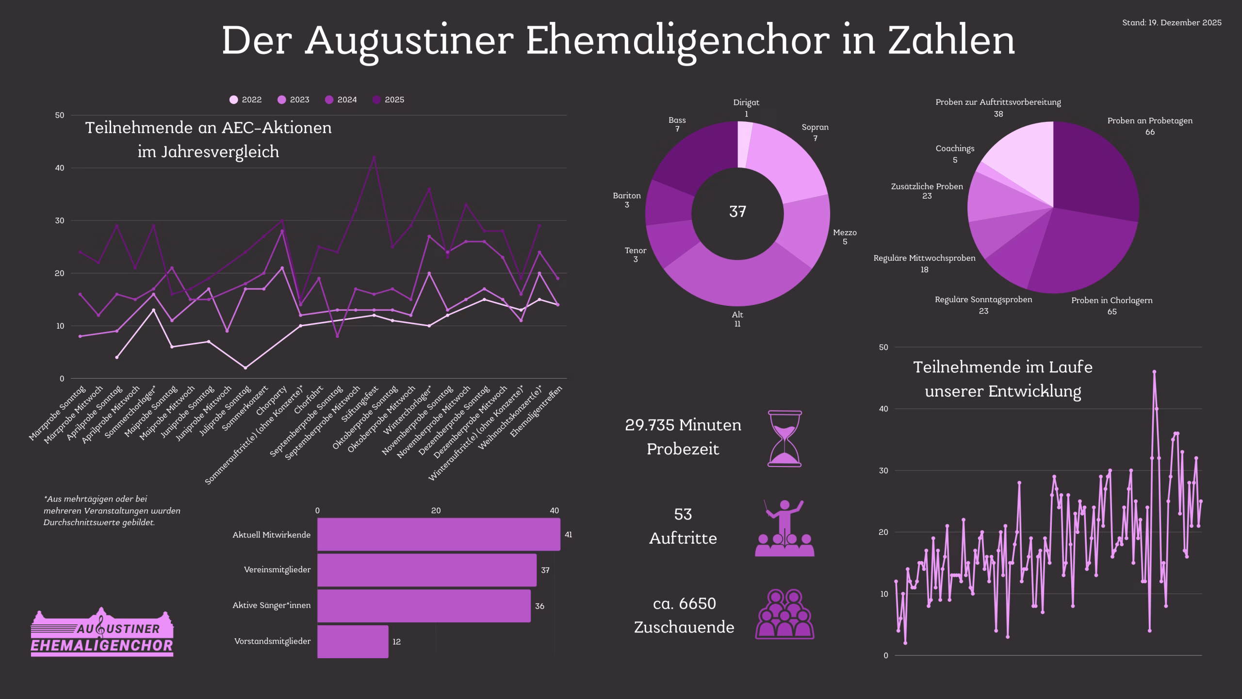 Dieser Mitgliederzuwachs war auch dringend notwendig: Denn während zum Sommerkonzert 24 starke Sänger*innen auf der Bühne standen, mussten wir 12 Leute aus dieser Besetzung zumindest partiell für die Wintersaison verabschieden. Als überwiegend studentischer Chor gehören bei uns Auslandssemester, Wegzüge nach Studienende, Wechsel an andere Universitäten oder eine Chorpause aufgrund zeitintensiver Abschlussarbeiten einfach dazu.
